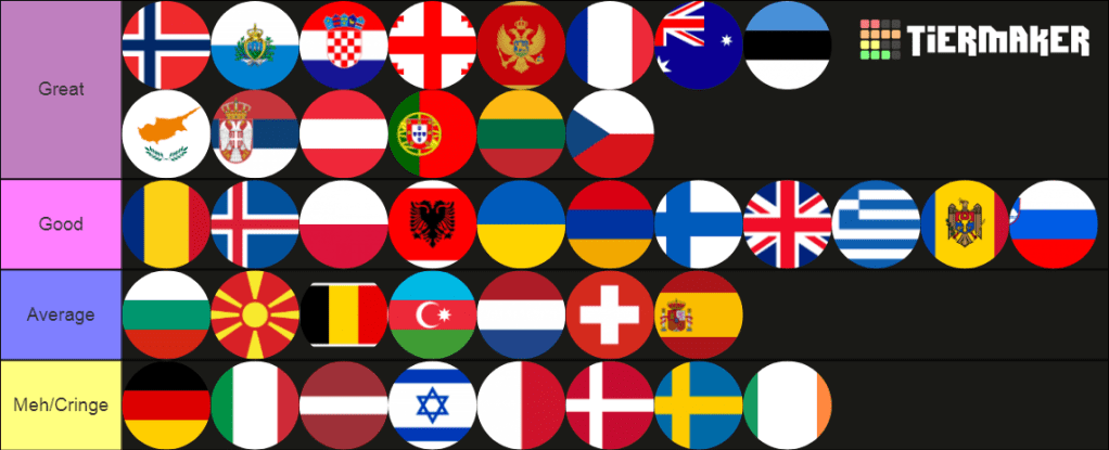 Here are my thoughts on the songs for Eurovision 2022 after the 2nd round of rehearsals. I have placed them in 4 tiers named Great, Good, Average and Meh/Cringe.